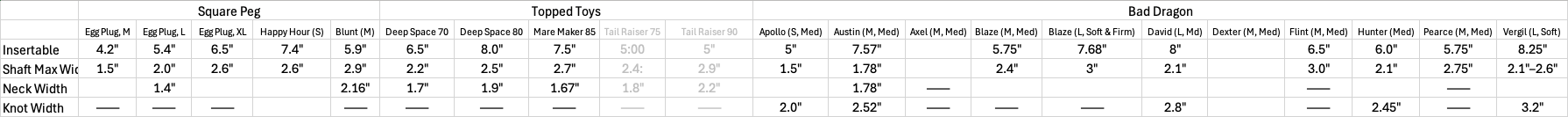 Hi Guys! First time posting here, I found the site when I was looking for recommendations on getting a sloppy hole. Maybe a New Year's Resolution? I've had my eyes set on this for awhile and gotten several plugs and dildos*, but my eyes are a lot bigger than my hole right now. 😞 Do you guys have any suggested stretching routines on how to get to that stage? Is it as simple as setting up some regimen and following it religiously, making sure my hole has something in it at least once a day? To give you an idea of where I am, I can get a Large Square Peg egg plug in, I have trouble with XL; I've only occasionally been able to get the Blunt in and it hurt like hell. I can get the Deep Space 80 in but it hurts, I've never been able to get the Mare Maker in. I've been able to get my Pearce Bad Dragon dildo in but only for a moment before I had to take it out. My goal is to be able to take something at least 3" wide (fist?) and penetrate my second hole without discomfort. *I tried to make a list of what I have, and it's kinda insane. See the attachment. Some measurements I couldn't find online so I need to go make, and the items in grey I was looking at but am shoving my wallet away until I can actually take what I have because this is a ridiculous collection built over the last few years.