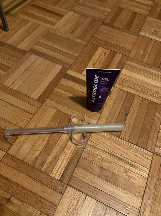 5. About 2 months ago I started saving my own loads that I planned on using as lube for a big cumdump night. I defrosted the jar but I wound up not using it (except for a little that one guy used to jerk me off.) That left me with a lot of my own jizz that I didn't want to refreeze. The next night I filled a lube injector and shot it as deep in my ass as I could. Put in a butt plug and walked out to a couple of bars with a massive amount of my own cum inside. I had no idea how hot I would find it to essentially fuck and breed myself. I licked out the last bit left in the jar and realized just how good my cum tastes. Between bars, I hooked up with one guy over Sniffies, stopped at his apartment, and sucked down his load. It was a quick bj and I kept my clothes on. He had no idea what I had in my ass and it was awesome. Went to another bar and had a drink, loving the feeling of my own massive loads. Finally went to a place with a dark room, dropped my pants and took out the plug. I sucked it clean and pocketed it for later. I positioned myself over a bench with my cum dripping out (I tried to hold it all in but liked I said, it was a lot.) It was late so it didn't take long for the first guy to fuck me. He must have thought I had been taking dick all night since I was so wet. You know how at the end of the night people are eager to get off and go home. He fucked me fast and added his load. I made it clear what I was there for so 2 more guys did the same. Lights went on so I had to call it a night. I put the plug back in and walked home with those three extra loads added to mine. I think I'm going to start saving my loads and do this again. Now I know how much I love my own cum in me. Of course I'd love to have other guys save up theirs so I could do this with the cum of a bunch of different men. I know that's hard to set up. Photo is my cum in the injector. I swallowed what I couldn't fit in it. I was surprised at either the small capacity of it OR the huge amount of cum I can wank over a couple of weeks. If you're a guy who saves his loads, I'd love to take yours or maybe trade.