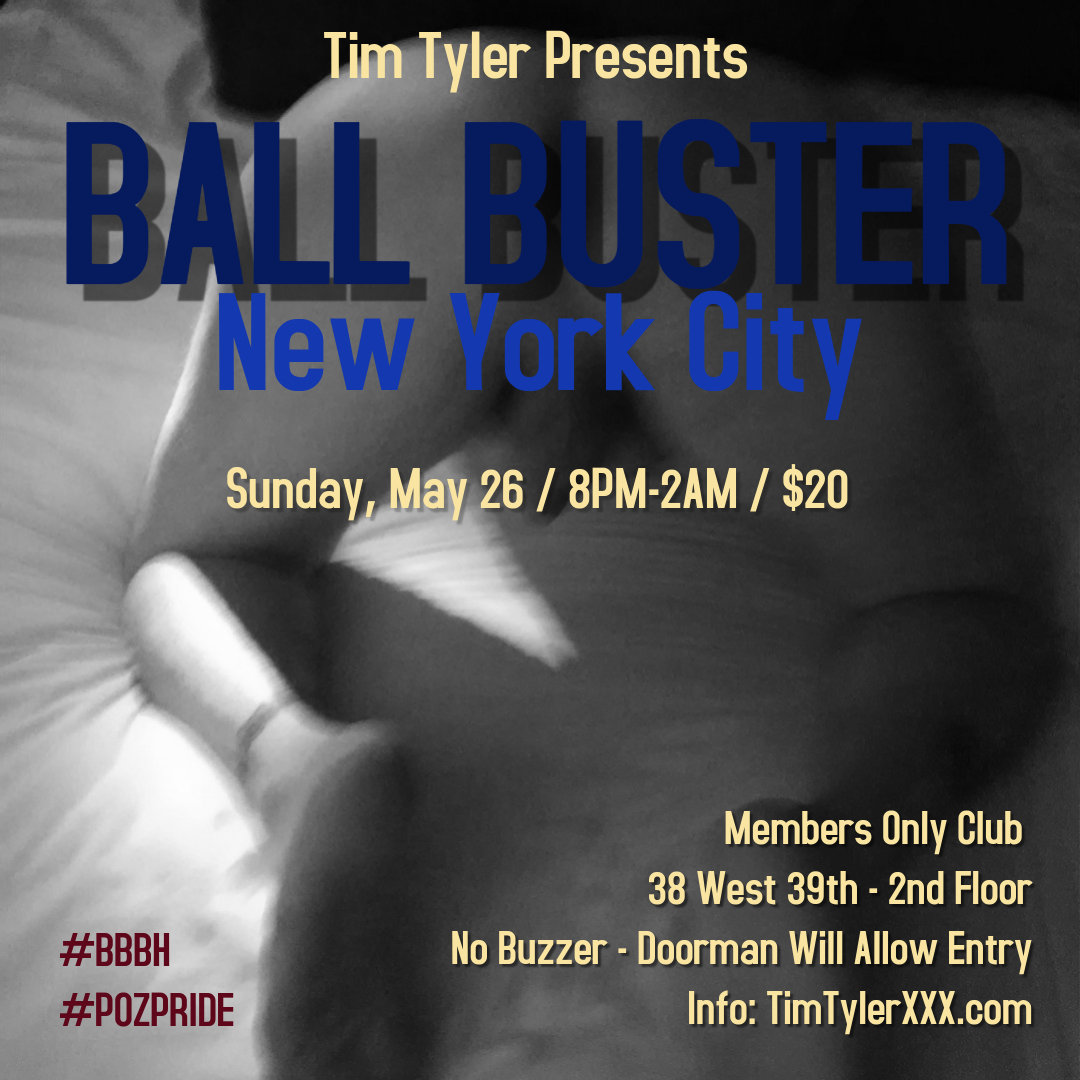 Ball Buster is a bareback sex party for gay men living with HIV/AIDS who, regardless of viral load, wish to play openly and without judgment.  Parties are held monthly at "Members Only Club" located at 38 W. 39th Street (2nd floor), New York City.  This is between 5th and 6th Avenues.  Please do not ring the buzzer - The doorman will allow entry.  8pm-2am.  $20 cash or credit.
