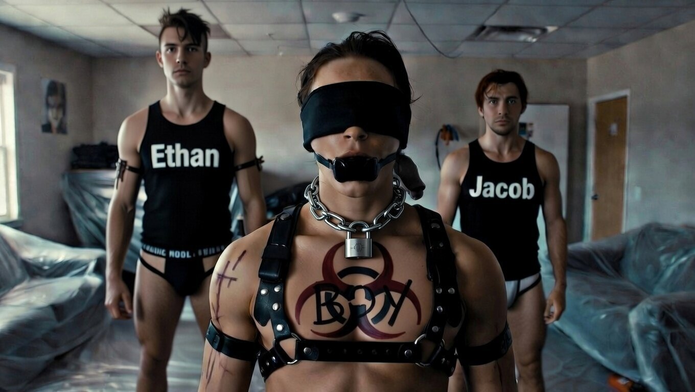 AI generated Fictional representation of real events as featured in Part 10 of The Truck and the Cage. Day 1 of Boy's use as a Submissive prior to the beginning of the Watersports Party.