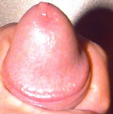 Foreskin bunched at the edge... with a dollop of precum dripping out.