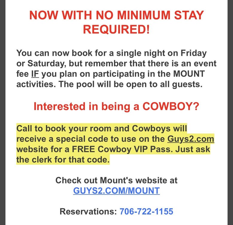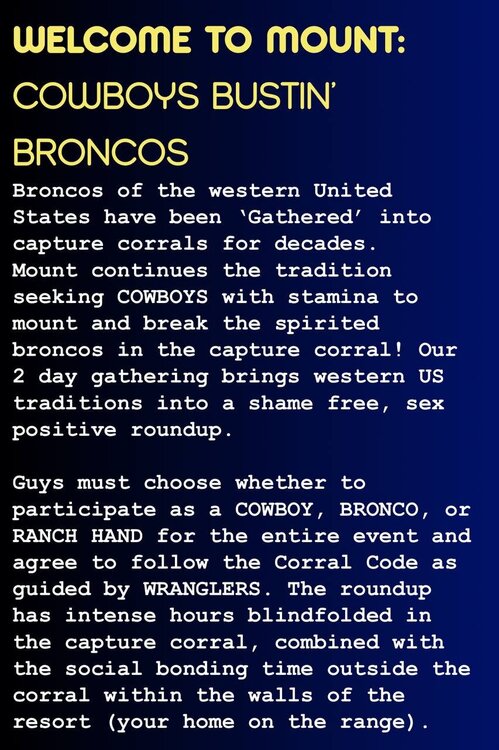 Mount2 is holding a horse-market style event where bottoms are blindfolded and set up for free use by tops. They just opened up free tickets for tops if anyone wants to travel down to enjoy some good sloppy hole at Metropolis. Call to book a room to get a code for a free ticket to the event. I'll be there as a Bronco bouncing back on whatever bone wants a go 😉 [think before following links] https://www.guys2.com/mount > What is MOUNT? Mount is a Cowboy themed sex party where you play one of four roles, Cowboys, Broncos, Ranch Hands, or Wranglers. Roles Explained: COWBOYS = Tops. Cowboys can wear anything they like or be completely nude. Cowboys may ONLY top Broncos or use services from Ranch Hands. Cowboys may not be a Bronco or Ranch Hand. BRONCOS = Bottoms. Broncos are harnessed and blindfolded and positioned in either a sling, on a bang box, or over a table or bench. Broncos may retire for the night and become a Cowboy. RANCH HANDS = Cowboy Fluffers. Ranch Hands are positioned in a pen at the entrance to the corral and may be blindfolded or not, they are there to service cowboys in need of a fluff either orally or with their hands. Ranch Hands may retire for the night and become a Cowboy. WRANGLERS = Event Volunteers. Wranglers assist Broncos in maintaining safety, leading Broncos in and out of the corral, and keeping the corral tidy. Wranglers may be a Cowboy at any time so long as they are not needed. Hope to see some of yall there ❤️