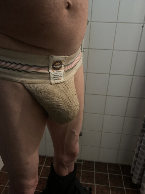 okay guys, I'm curious what your jock looks like with piss and cum stains, show me your jock this is my jock -
